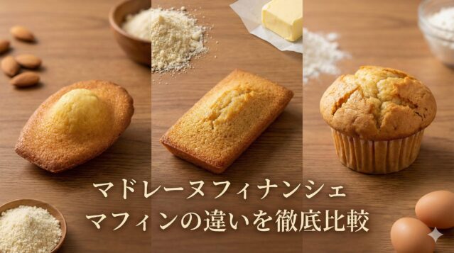 マドレーヌ・フィナンシェ・マフィンの違いは、「形」「材料」「食感」の3点で整理するとすぐに見分けられます。