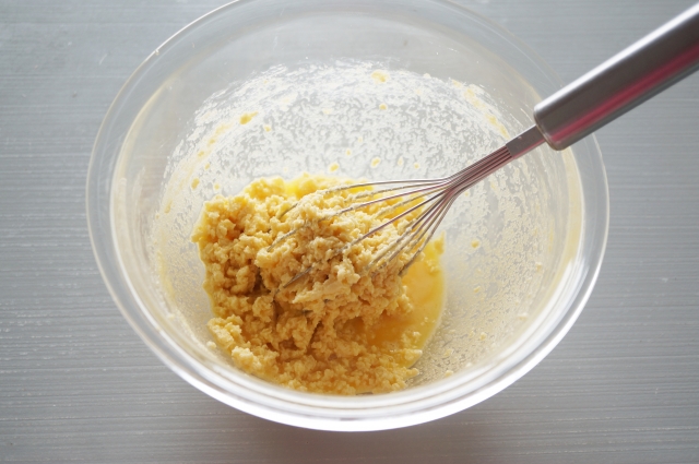 バターと砂糖を混ぜたあとに卵を加えるときは、必ず少しずつ加えるのが基本です。
