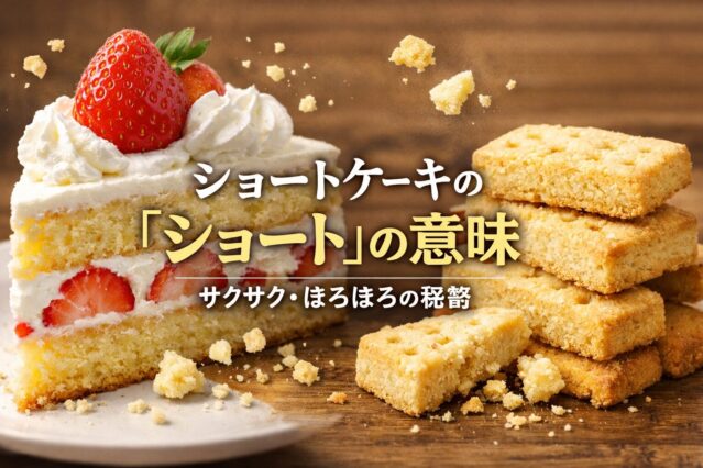 ショートケーキの「ショート」とは、「短い」という意味ではなく、バターや油脂を多く使うことで生まれる、サクッと崩れる食感を表す製菓用語です。