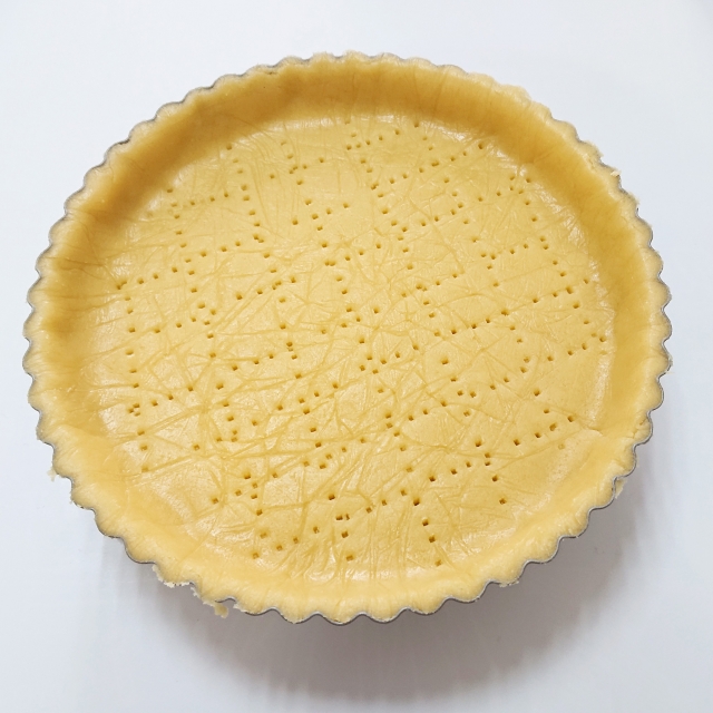 1. タルト生地を型に敷き、底にピケをした後、冷蔵庫で最低30分以上休ませる。休ませることで生地が縮みにくくなり、仕上がりが安定します。