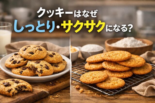実は、水分の残り方、砂糖やバターの性質、卵や粉の配合、焼き方や冷まし方までが複雑に関わって、「しっとり」と「サクサク」の差を生み出しています。